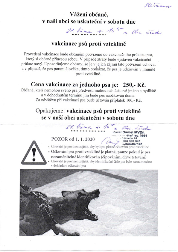 Oznamujeme občanům, že v sobotu 21. března 2026 od 10:15 hodin bude před obecním úřadem probíhat očkování psů. Cena očkování je 250,- Kč/psa.